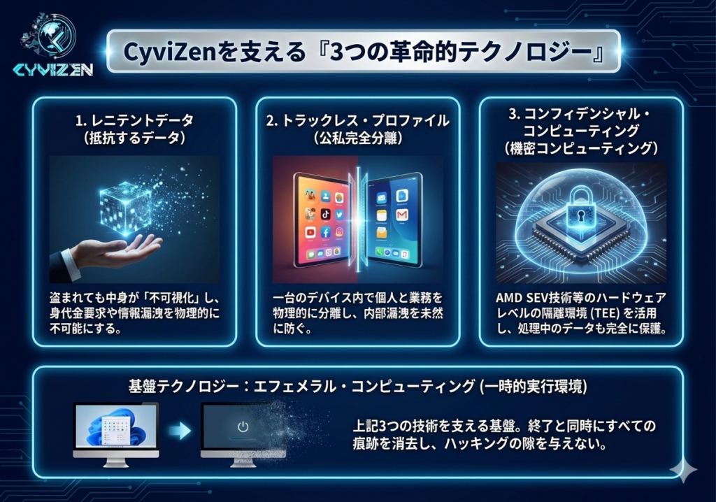 これが、CyviZenを支える「4つの盾」 - トラックレス・プロファイル: 公私を分け、内部漏洩の「道」を断つ。