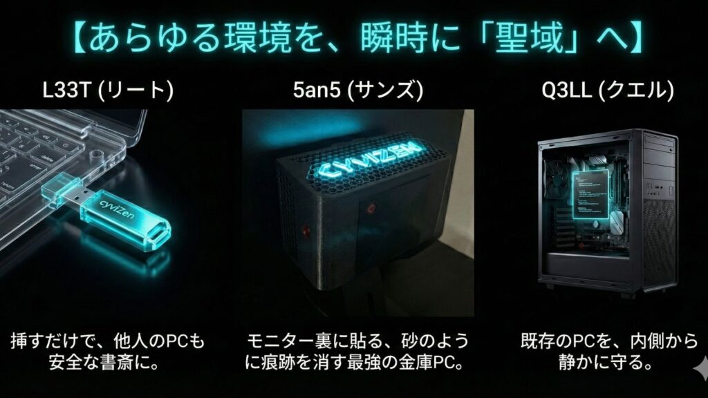 | 情報の持ち出し | USBや PC紛失による 漏洩リスク大 | L33T+物理鍵で紛失しても「ただの砂」 | 損害賠償・社会的信用 失墜の回避 |