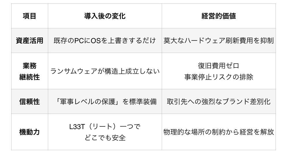| 万が一の感染 | 事業停止・莫大な復旧費 ランサムウェアに感染すれば、 全データが人質になり 数週間の業務停止も | 被害ゼロ・即時継続 OSの構造上、データ破壊や暗号化が不可能。ウィルスが入っても再起動で消滅 |